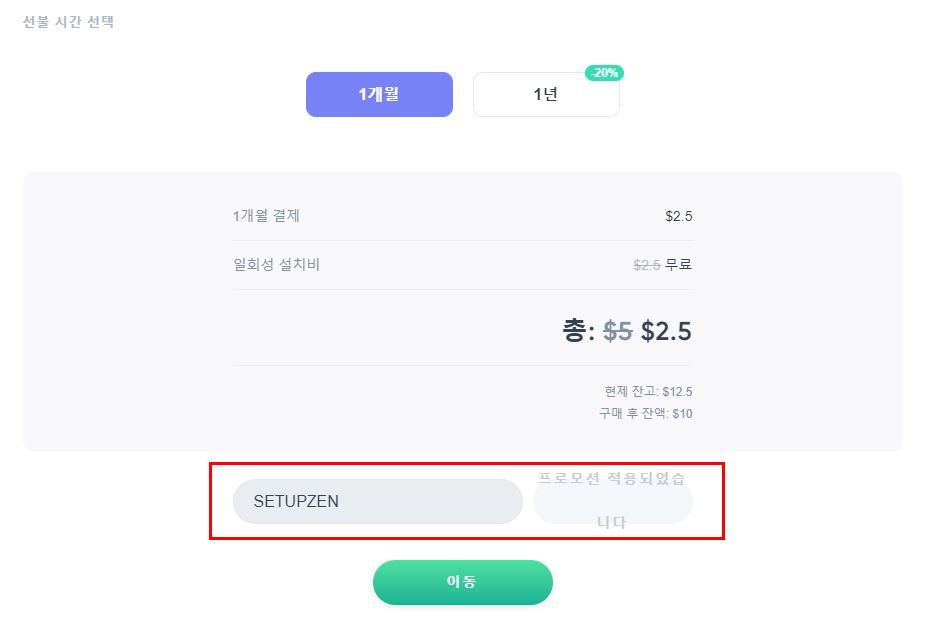 하단의 프로모션 코드에 SETUPZEN을 입력 후 적용을 눌러주면 최초 설치비용이 무료로 바뀐다.