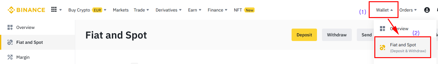 코인을 옮기기 위해 우측 상단의 Wallet > Fiat and Spot을 누르고..