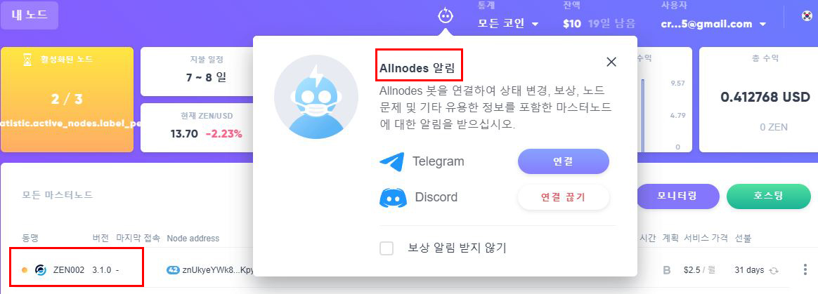 상단의 Allnodes알림을 설정해두면 보상이 들어올때마다 알림을 받을 수 있다.