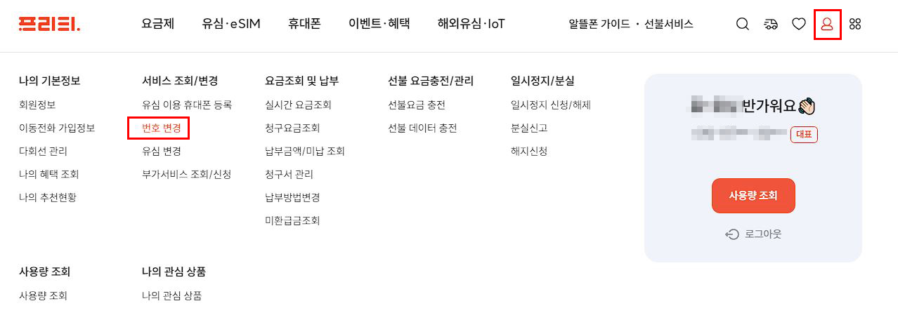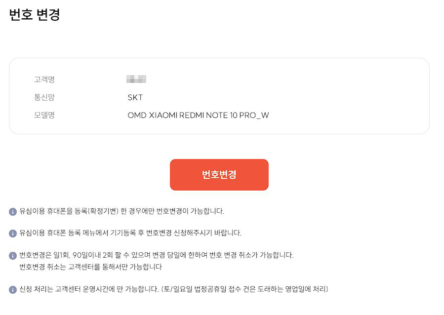 상단 메뉴 중 서비스 조회/변경 -> 번호변경을 클릭 [링크]